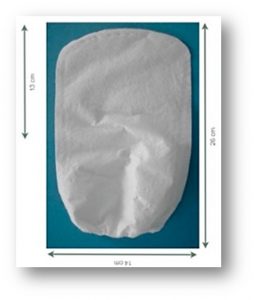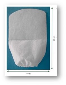 Manopla para lavado, de tela no tejida, resistente hasta 40º C de temperatura; hipoalergénica, suave, no irritante a la piel; forma y ajuste anatómico e impregnada de substancias tensioactivas y antisépticas. y Manopla para secado, de tela no tejida, absorbente, hipoalergénica, suave, no irritante a la piel; forma y ajuste anatómico.